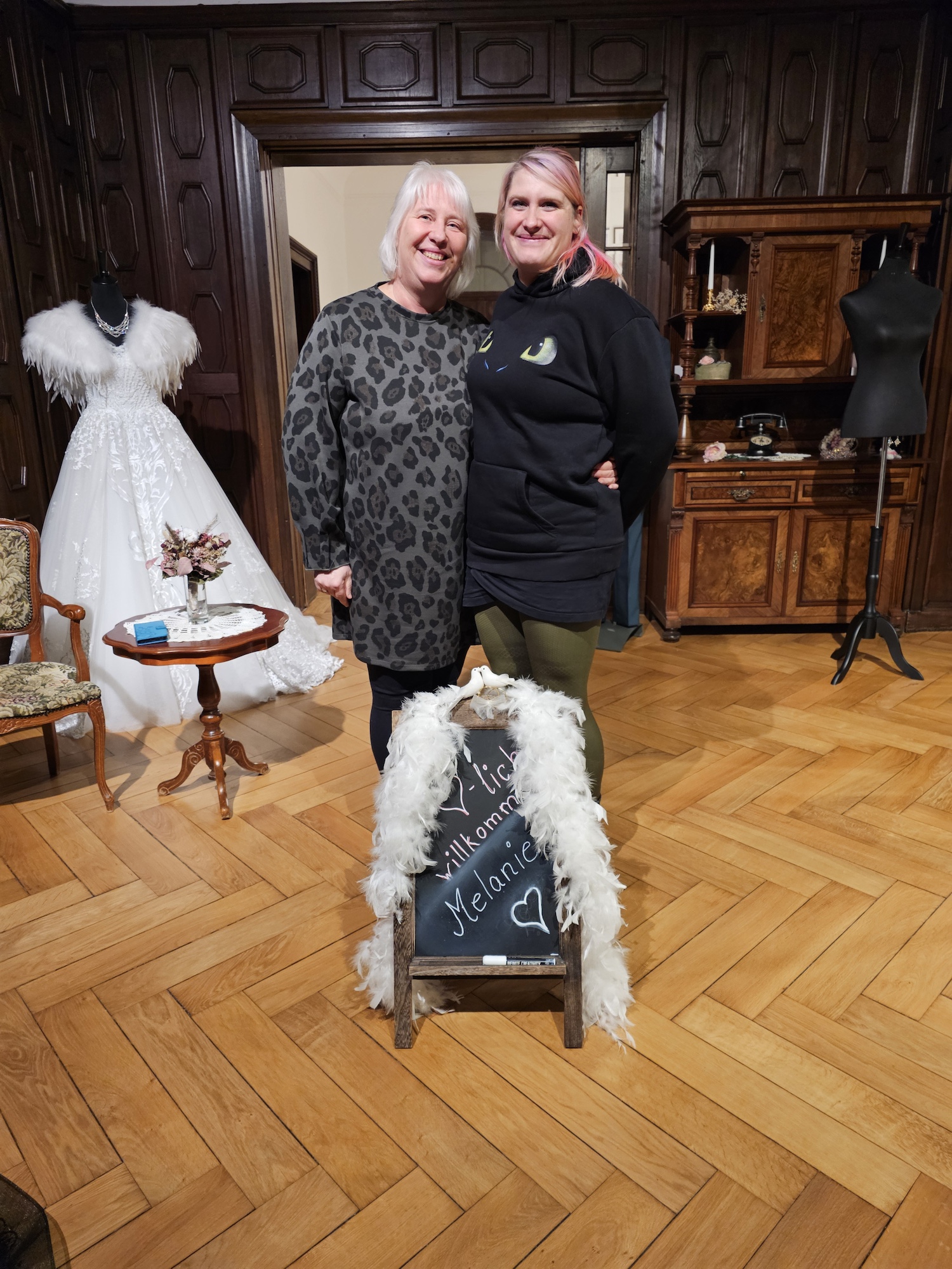 "So eine Brautkleidberatung findet man nicht noch einmal. Vergesst Tüll und Tränen im „Robe de marièe“ findet ihr ein Komplettangebot der Sonderklasse. Vom persönlichen Willkommensschild, über kulinarische Genüsse und Gesangseinlagen, bis hin zur über aus kompetenten Beratung, verbunden mit einem wunderschönen Ambiente, bleiben keine Wünsche offen. Wir waren zwar nur die Begleiterinnen der Braut, aber auch für uns wird der Nachmittag unvergessen und in wunderschöner Erinnerung bleiben. Wir haben uns gefühlt, als würden wir bei langen bekannten Freunden ein Brautkleid kaufen, so liebevoll und offen wurde mit allen umgegangen. Nochmal vielen vielen lieben Dank an euch!!! Mit der nächsten Braut kommen wir wieder zu euch :)" Annett und Anja